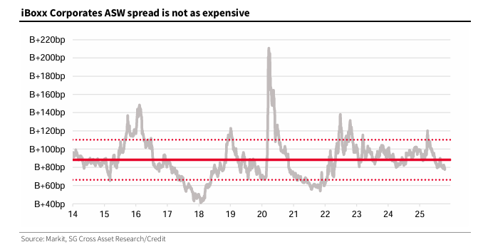 ASW(Asset Swap) 스프레드를 보면 벤치마크 대비 스프레드만큼 비싸지는 않아 보였음. ASW 스프레드는 평균보다 낮지만, 1표준편차 아래에는 근접하지도 않았으며, 2021년이나 2018년에 관찰된 수준보다 훨씬 넓었음.
