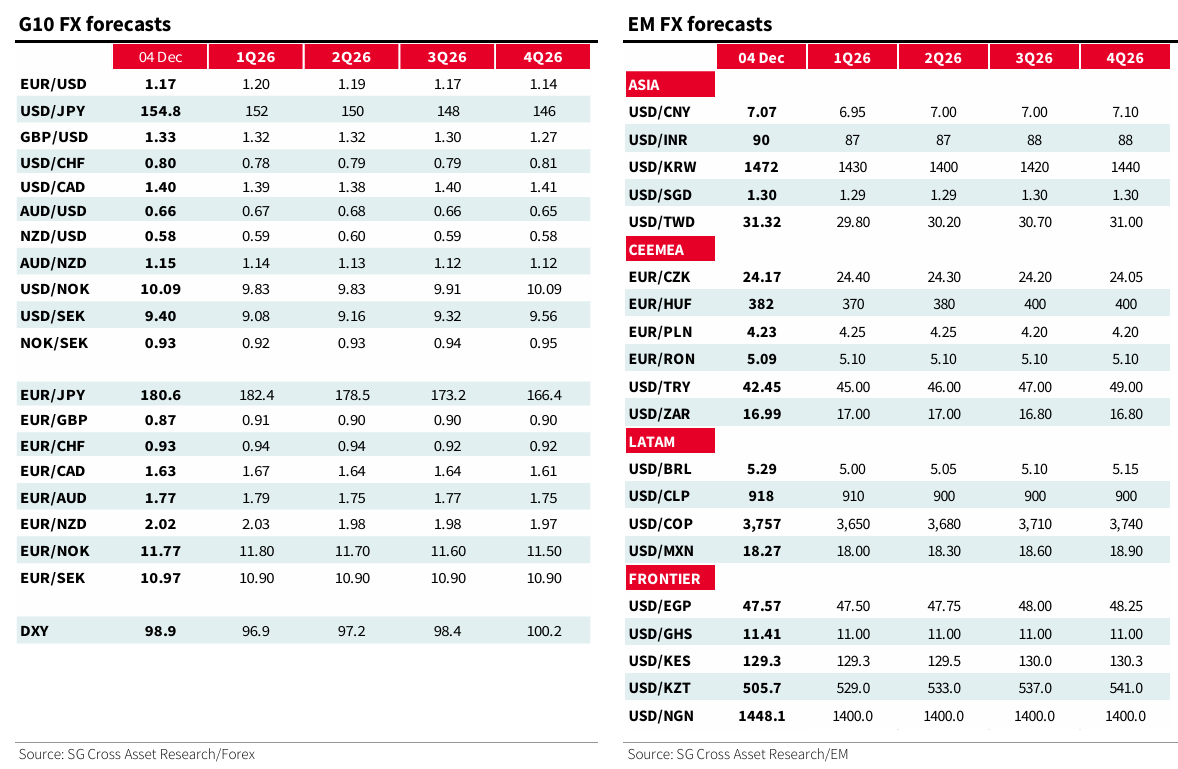 전반적으로 합의는 DXY가 점진적으로 하락할 것으로 예상하지만, 우리는 상반기에 약세를 보인 후 하반기에 회복하여 현재 수준보다 강하게 2026년을 마감할 것으로 예상했으며, 이는 합의 예상치보다 훨씬 높은 수준이었음.