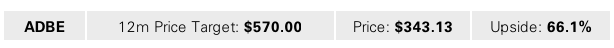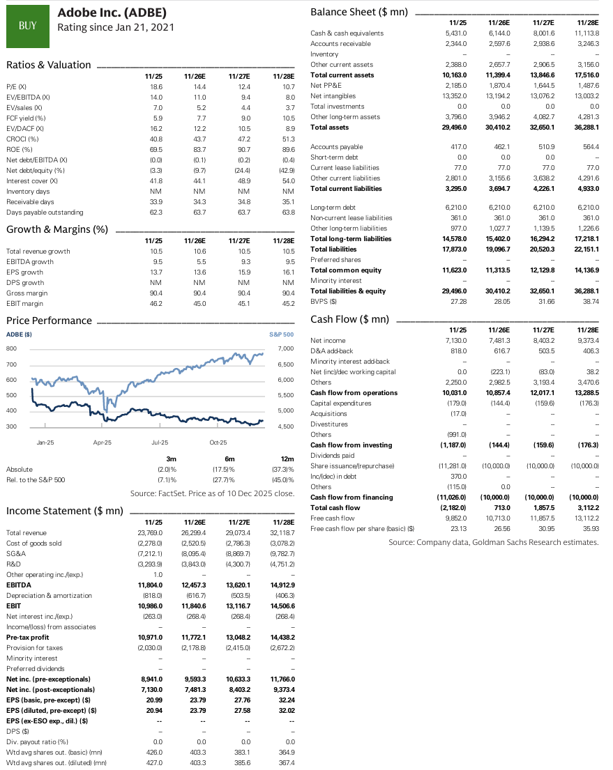Goldman Sachs는 Adobe의 F4Q25 실적 발표 후 매수(Buy) 등급 및 목표 주가 $570를 재차 강조했음.