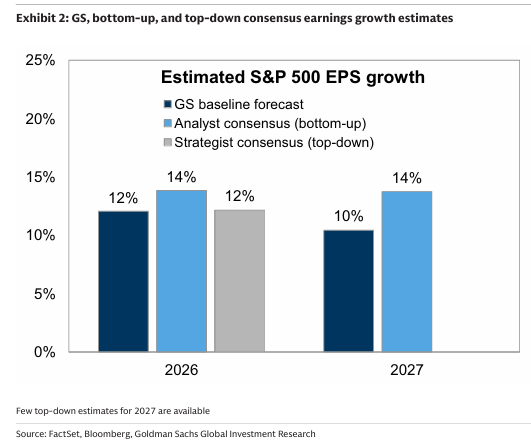 • 2026년과 2027년 GS의 전망치는 하위-상향식 컨센서스 추정치보다 낮지만, 이 애널리스트들의 추정치는 보통 너무 낙관적임.