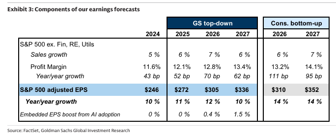 • 2026년 GS의 EPS 전망치는 상위-하향식(top-down) 전략가들의 중앙값 추정치와 일치하나, 하위-상향식(bottom-up) 애널리스트 합의보다는 낮음.