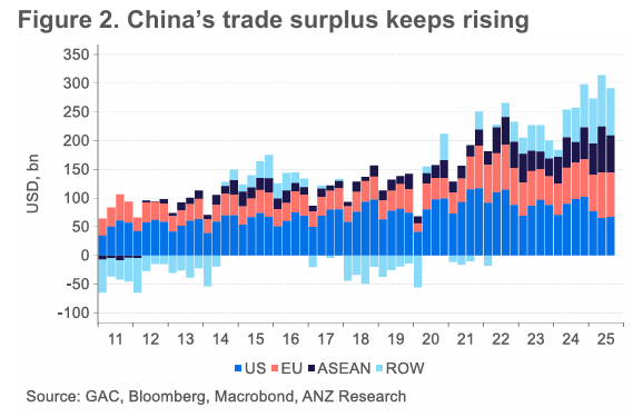 중국의 무역 흑자 확대는 특히 국내 제조업을 회생시키려는 노력 속에서 주요 무역 파트너들과의 분쟁을 일으킬 수 있음. 그러나 문제는 가격에 있음. 관세가 인상되더라도 중국 제품의 가격은 매력적이며 무역 긴장은 지속될 수 있음. 향후 중국의 수출 패턴은 견조한 글로벌 경제 성장 전망에 힘입어 2026년까지 안정적으로 유지될 것으로 예상됨. AI 유도 글로벌 전자 사이클의 약화는 하방 리스크가 될 수 있음. 그러나 2025년의 높은 기저 효과로 인해 내년 전년 대비 성장 속도는 완화될 수 있음.