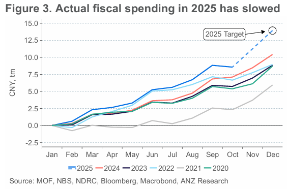 중국 경제는 지속적인 반내권(anti-involution) 정책과 부양책 부재로 인해 2025년 4분기에 둔화됨.