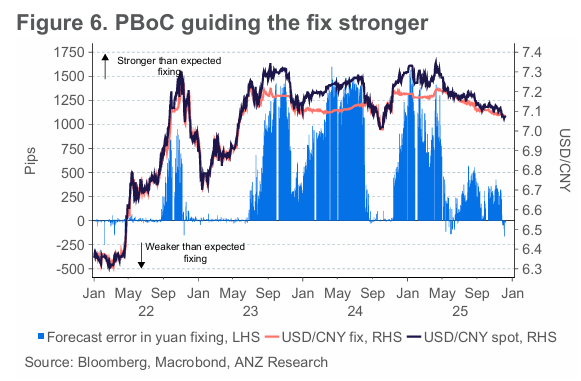 인민은행은 2025년 9월 말에서 11월 사이와 같이 달러가 반등하는 시기에도 기준환율(fix)을 강세로 유도해 왔음. 이는 당국이 통화 강세를 수용하고 있다는 명확한 신호임. 중국의 성장이 수출에 의존할 수 있지만, 실질실효환율(REER)은 매우 낮고 저평가되어 있음. 위안화의 추가 절상이 중국의 수출 경쟁력을 훼손하지는 않을 것임. 강한 통화는 구매력을 높여 가계 소비를 진작하는 데 도움이 될 수 있음.