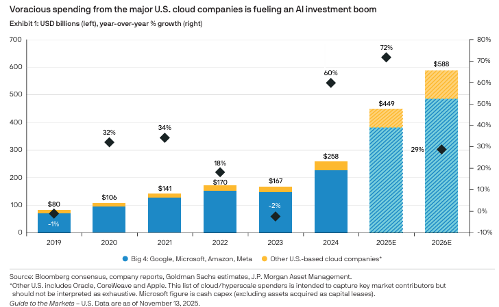 • K자형 경제: 하단의 약세가 상단의 강세와 균형을 이루며, 빅테크가 AI에 계속 투자하고 고소득 가계가 소비를 지속하는 한 골디락스 환경이 유지될 수 있음.