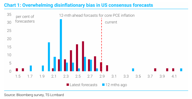 • 차트 1: 미국 컨센서스 예측에 나타난 압도적인 디스플레이션 편향을 보여줌. 핵심 PCE 인플레이션에 대한 12개월 후 예측치가 2% 초반에 집중되어 있음.