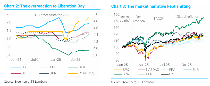 • 차트 2: 해방의 날(Liberation Day)에 대한 과잉 반응을 보여줌. 주요국의 GDP 전망치가 시간이 지나며 어떻게 변화했는지 나타냄.
