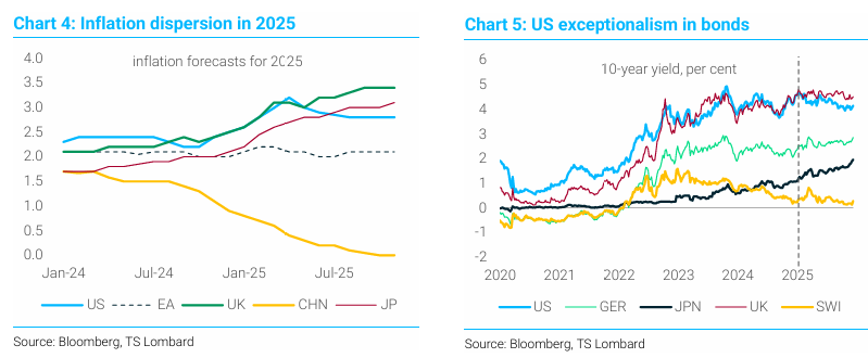 • 차트 4: 2025년 인플레이션 전망의 분산을 보여줌. 영국과 일본의 수치가 눈에 띄게 상승함.