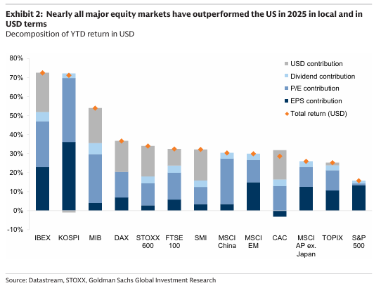 2025년 주요 주식 시장의 수익률 분해 (EPS, P/E, 배당, 환율 기여도 표시). 거의 모든 시장이 미국을 상회