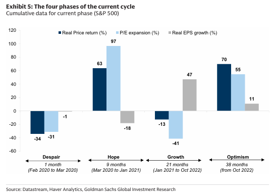 • 차트 4는 지난 50년 이상의 미국 주식 시장 경험 평균을 보여주지만, 각 단계가 실제 이익 성장과 미래 이익 성장에 대한 기대치(P/E 배수의 변화로 측정 가능)에 의해 지수 성과가 어떻게 좌우되는지를 반영함.