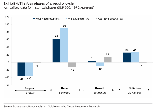 • (ii) '희망(Hope)' 단계: 시장이 저점 밸류에이션에서 반등하는 짧은 기간(P/E 배수 확장). 일반적으로 가장 강력하며 6~12개월간 지속됨.
