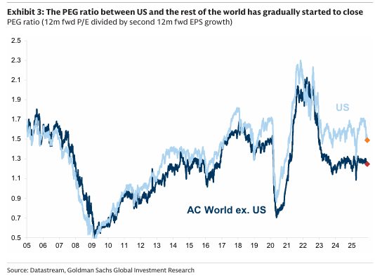 미국과 미국 제외 AC World의 PEG 비율 추이. 두 지역 간의 격차가 점진적으로 좁혀지기 시작했음을 보여줌.