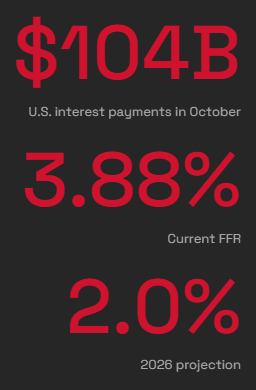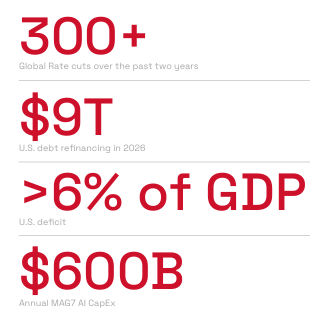 재정적 궤적이 매우 확장적인 상태를 유지하고 있는 가운데(2026년 GDP 대비 6% 이상의 적자와 약 9조 달러의 재융자 필요액), 금리 인하와 추가 유동성 지원에 대한 구조적 압력은 여전히 강하게 남아 있습니다.