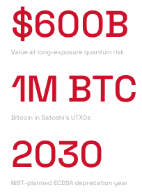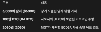현재 670만 BTC(약 6,000억 달러 가치)가 안전하지 않은 UTXO 유형에 보관되어 있거나 주소 재사용 문제로 인해 암호학적으로 유의미한 양자 컴퓨터(CRQC)에 취약한 상태입니다.