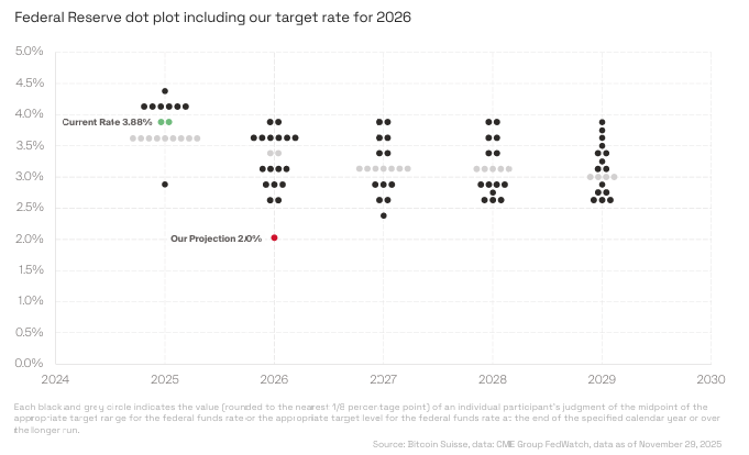 백악관의 메시지는 명확합니다. 높은 금리는 재정 프로그램, 정치 일정, 그리고 38조 달러에 달하는 부채의 지속적인 재융자 필요성과 양립할 수 없습니다. 따라서 우리는 연방기금금리가 2026년 말까지 2.0%로 유지될 것으로 예상합니다. 이는 인플레이션이 목표치로 완전히 복귀했는지 여부와 관계없이, 특히 관세가 인플레이션을 경직시키는 경우 더욱 그러합니다. 2%대의 정책금리는 2%대 중반의 인플레이션에 맞춰 설정되며, 이는 과거 금과 비트코인 같은 실물 자산뿐 아니라 위험 자산의 가격을 끌어올렸던 거시경제적 조합을 재현합니다.