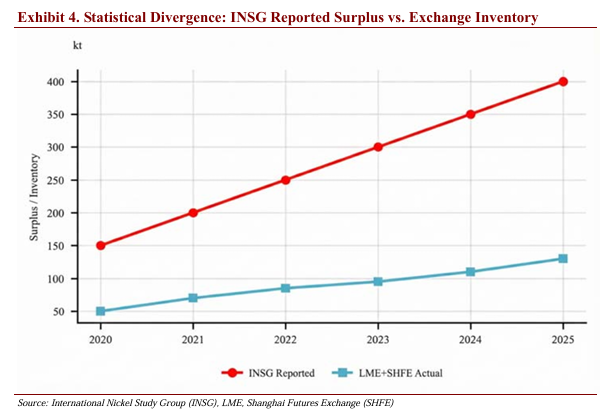 2025년 공급 과잉의 신기루: 가장 놀라운 점은 2025년에 INSG가 약 45만 톤의 과잉을 보고했다는 것임. 그러나 같은 기간 실제 LME 니켈 재고 증가는 약 15만 톤에 불과했으며, SHFE 재고는 비교적 안정적이었음. INSG가 보고한 공급 과잉과 실제 확인된 물리적 재고 축적 사이의 암묵적 격차는 대략 30만 톤으로, 실제 거래소 창고에서 관찰된 재고 빌드업의 약 200%에 해당함.