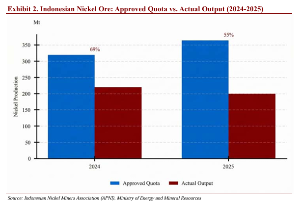 Exhibit 2. 인도네시아 니켈 원광: 승인 쿼터 vs 실제 생산량 (2024-2025)