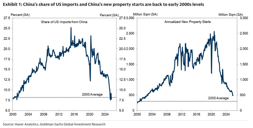 2025년 말까지 미국의 중국 수입 시장 점유율과 중국 국내의 신규 부동산 착공은 2000년대 초반 수준으로 돌아갔으며, 이는 2001년 WTO 가입과 1998년 중국 주택 개혁 이후의 성과를 지워버린 것임. 중국 경제의 주요 과제는 새로운 성장 동력을 찾는 것임.