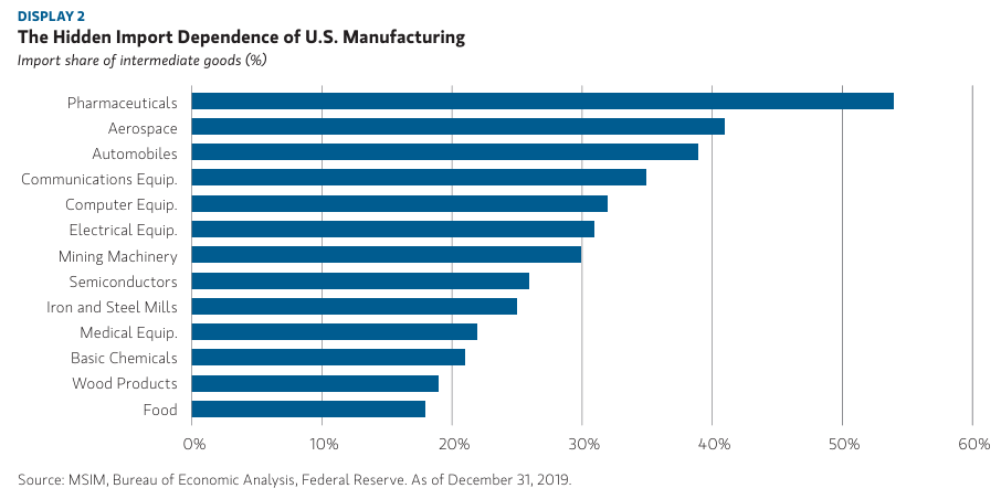미국은 복잡한 수입품을 빠르게 대체할 수 있는 숙련 노동력과 자본 스톡을 보유하고 있지 않음. 미국 수입의 거의 절반은 완제품 생산에 필요한 중간재임. 이러한 부품에 관세를 부과하면 보호가 아니라 경쟁력 약화로 이어지며, 특히 제약, 항공우주, 자동차, 컴퓨터, 기계 산업에서 그 영향이 큼(도표 2).