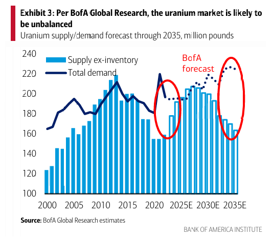 채굴된 우라늄의 99%는 원자력 발전에 사용되며, 이는 전 세계 전력 생산의 약 10%에 해당함. 따라서 BofA 글로벌 리서치에 따르면 우라늄 수요는 글로벌 전력 수요에 의해 결정되며, 이는 당해 연도 연료 수요와 재고 축적이라는 두 가지 요소로 구성됨. 2030년대까지 전력 수요 급증으로 총수요는 증가하는 반면 공급은 감소해, 우라늄 시장의 수급 불균형이 나타날 것으로 전망됨(도표 3).