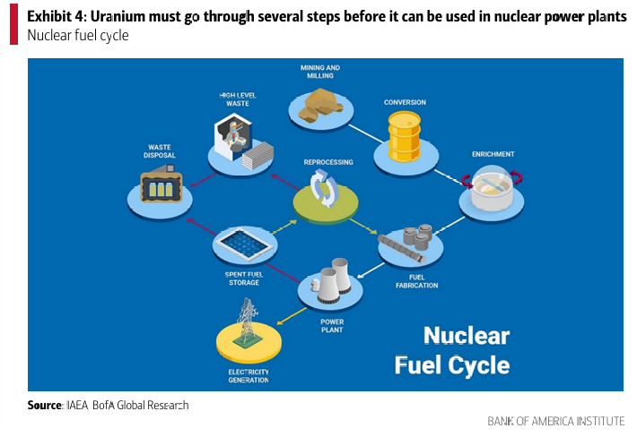 한편, 핵융합(fusion)이라는 또 다른 형태의 원자력 에너지도 있음. 이는 가벼운 원자핵을 결합해 에너지를 방출하는 방식으로, 핵분열보다 더 깨끗하고 강력한 대안으로 연구되고 있으나, BofA 글로벌 리서치에 따르면 아직 상업화 단계에는 이르지 못했음.