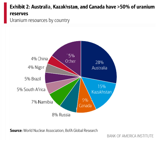 미국이 현재 가장 큰 원자력 발전소 보유국이긴 하지만, BofA 글로벌 리서치에 따르면 현재 원자로 건설을 주도하는 국가는 중국으로, 15개의 신규 원전이 개발 중임. 한편 캐나다와 호주 같은 국가들은 우라늄과 같은 핵심 원자재 공급국으로서 필수적인 역할을 수행함.