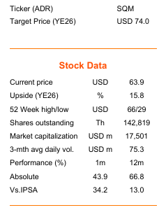 우리는 SQM의 목표주가를 주당 USD 55 → USD 74로 상향 조정하며, Outperform 의견을 유지함. 이번 조정은 최근 몇 주간 시장 심리가 명확하게 전환되며 리튬 펀더멘털에 대해 보다 낙관적인 시각을 반영한 것임.
