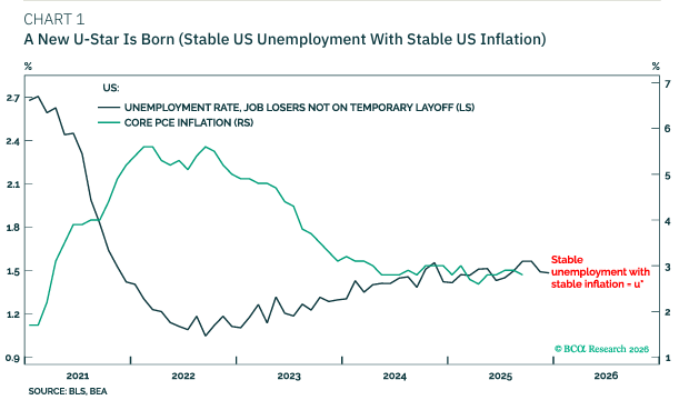 2025년 동안 ‘나쁜 실업률’이 안정되었고, 동시에 인플레이션도 안정되었다는 점은 미국 경제가 이미 u* 수준에 도달했거나 그 근처에 있음을 의미한다. 흥미롭게도, 팬데믹 직전에도 미국 경제는 u* 상태에 있었다. 2018~2019년 동안에도 인플레이션은 안정적이었고, 실업률 역시 안정적이었다. 하지만 현재의 u*는 과거와는 다른 새로운 u*이다.