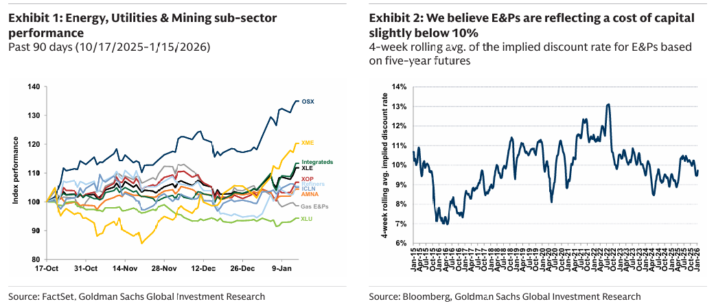 귀금속 섹터는 정치·경제 불확실성 확대 속에 강하게 한 해를 시작함. 2025년에 이미 90% 상승했지만 상승 요인은 여전히 유효하며, 2026년 추가 상승 여지가 있음. 다만 연말로 갈수록 지정학 및 무역이 안정되면서 일부 되돌림이 예상됨.