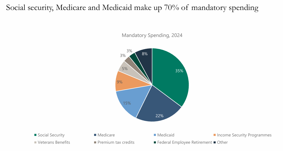 • 사회보장, 메디케어, 메디케이드가 의무지출의 70%를 차지
