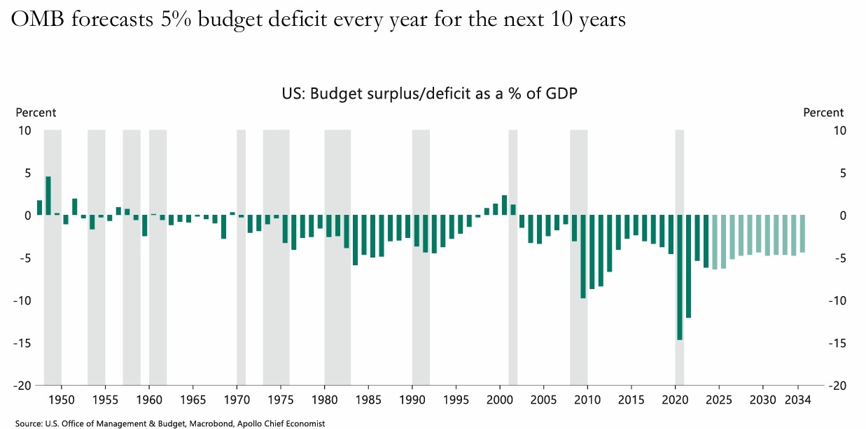 • OMB는 향후 10년간 매년 5%의 예산적자를 전망함