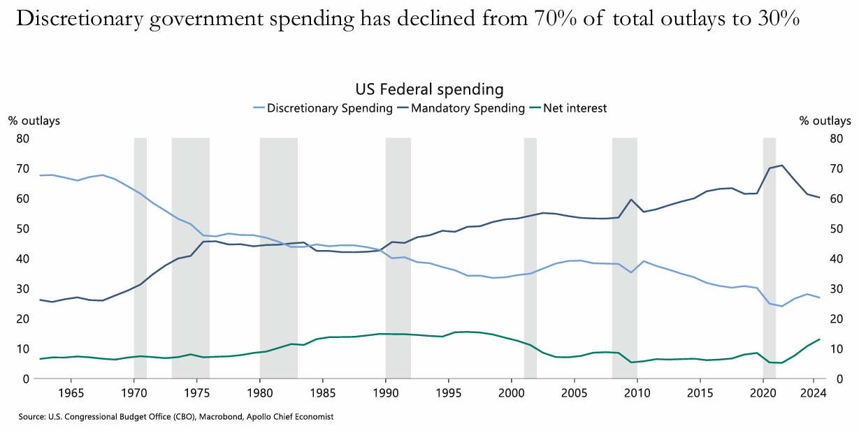 • 재량적 정부지출은 전체 지출의 70%에서 30%로 감소함