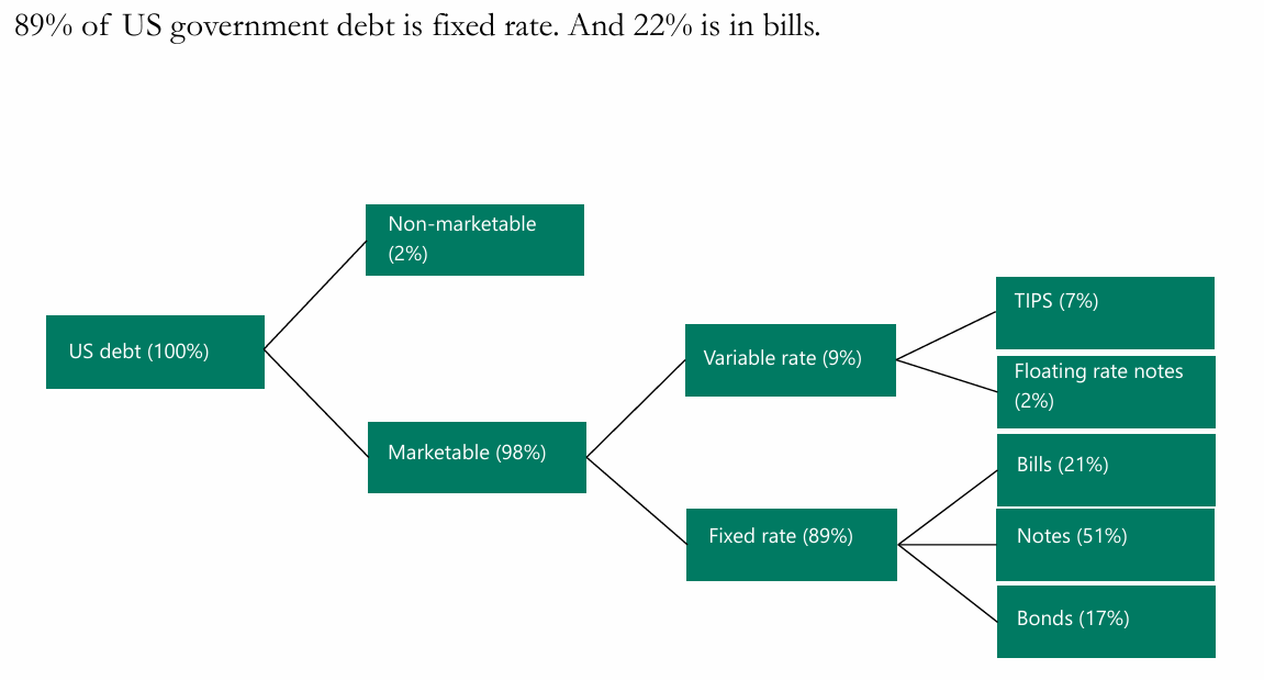 • 미국 정부 부채의 89%는 고정금리. 그리고 22%는 단기국채(Bills).