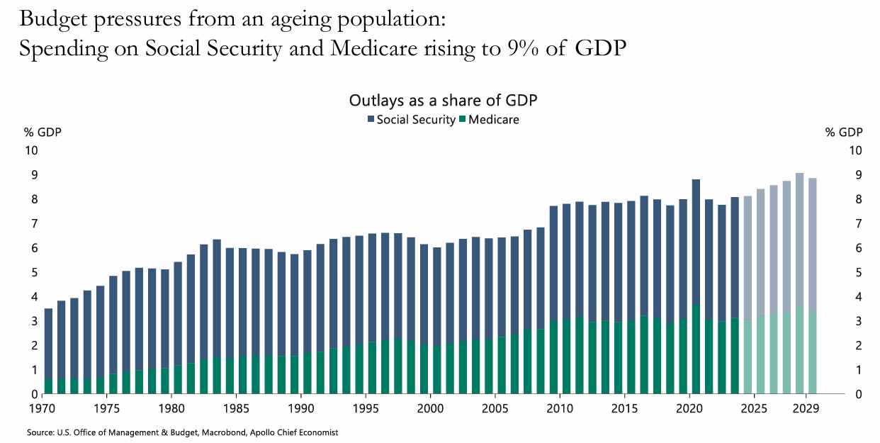 • 고령화 인구로 인한 예산 압박: 사회보장 및 메디케어 지출이 GDP의 9%까지 상승