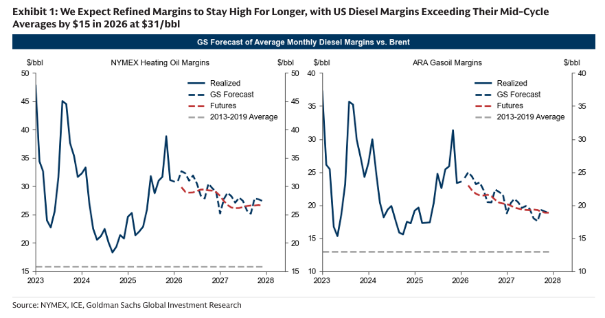 Exhibit 1: 정제 마진은 더 오랫동안 높은 수준을 유지할 것으로 보이며, 2026년 미국 디젤 마진은 중기 평균 대비 $15 높은 $31/bbl에 도달할 전망