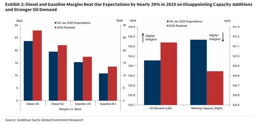 2025년 미국 및 유럽 디젤·가솔린 평균 마진(Brent 대비)은 우리가 2025년 1월에 발표한 전망치를 $2–4 상회했다(Exhibit 2). 이는 석유 수요가 예상보다 0.2mb/d 더 높았던 반면, 실제 가동 가능한 정제 설비는 설비 증설 지연과 멕시코(Dos Bocas), 나이지리아(Dangote), 인도 프로젝트의 기대 이하 가동 속도로 인해 0.3mb/d 부족했기 때문이다.
