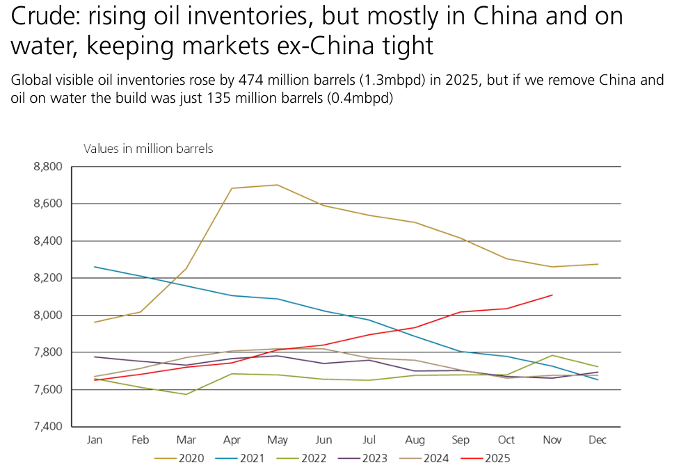 2025년 평균 운임 또한 우리의 예상보다 거의 $1(25%) 높았다. OPEC+ 물량 복귀, 지정학적 충격, 제재 대상 공급에 대한 압박 증가로 해상 재고(oil on water)가 사상 최고치로 증가했기 때문이다.