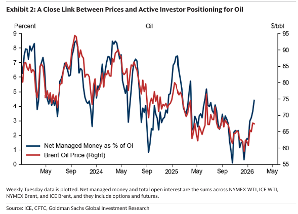 2026년 원자재 시장이 강하고 변동성 높은 출발을 보인 이후, 우리는 능동적 투자자 포지셔닝(active investors positioning) 이 가격에 미치는 영향을 분석한다 (역사적으로 지수 투자자들은 가격에 거의 영향을 주지 않았기 때문).