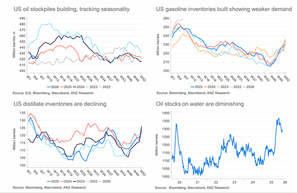 미국 원유 재고는 계절적 패턴에 따라 증가. 미국 디젤 재고는 감소. 미국 휘발유 재고는 증가하며 수요 약세를 반영. 해상 원유 재고는 감소. 미국 원유 재고는 증가 중.