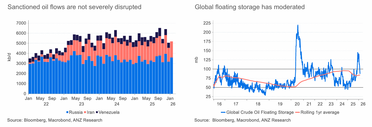 제재 대상 원유 흐름은 심각하게 차단되지 않았음. 제재 원유는 우회되고 있으나 중단되지는 않음. 글로벌 부유 저장량은 완화됨.