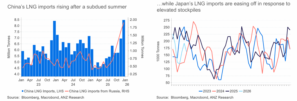 중국 LNG 수입은 부진했던 여름 이후 증가. 일본 LNG 수입은 높은 재고에 대응해 둔화. 강한 수요와 낮은 가격이 아시아 LNG 수입을 지지.