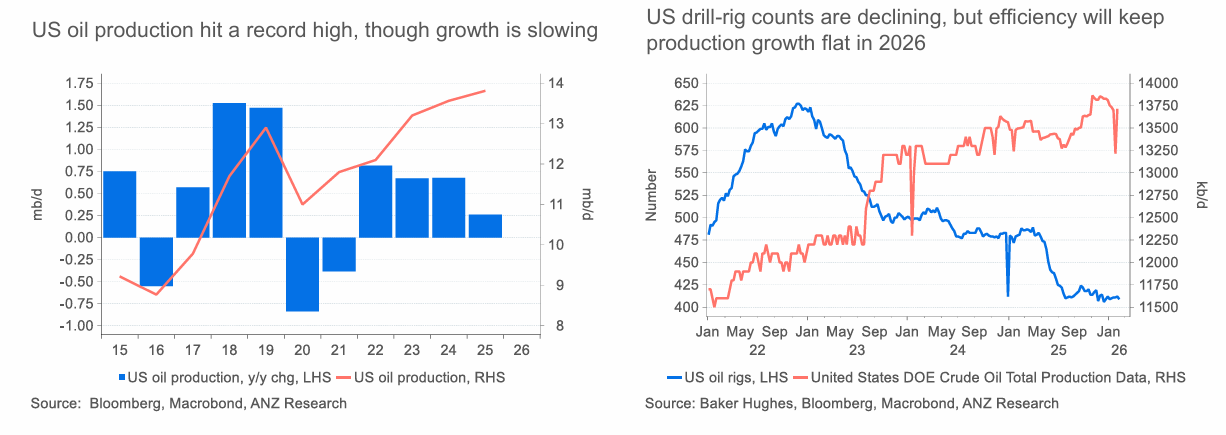 미국 원유 생산은 사상 최고치를 기록했으나 증가 속도는 둔화. 미국의 시추 리그 수는 감소하고 있으나 효율성 향상으로 2026년 생산 증가는 보합 수준을 유지할 전망. 미국 원유 생산 증가세는 둔화되고 있음.
