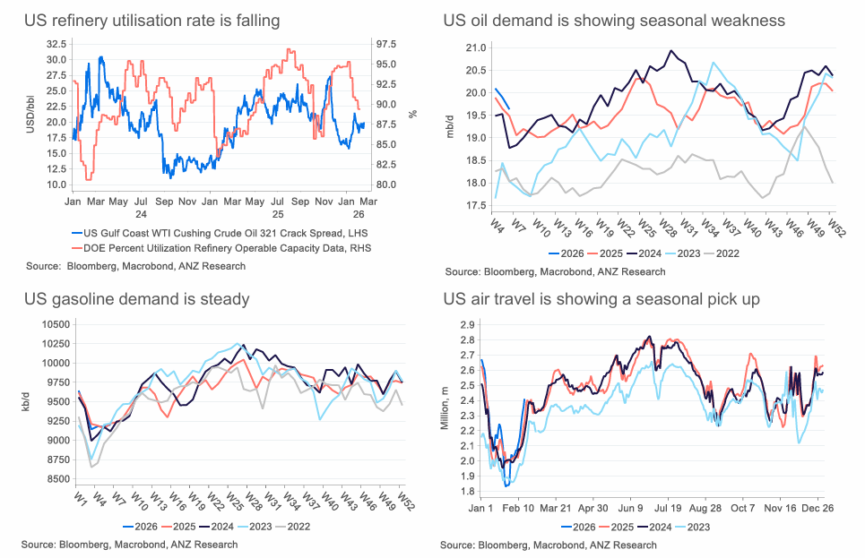 미국 정유 가동률은 하락. 미국 휘발유 수요는 안정적. 미국 원유 수요는 계절적 약세를 보임. 미국 항공 여행은 계절적 반등을 보임. 미국 원유 수요는 계절적 둔화를 기록 중.