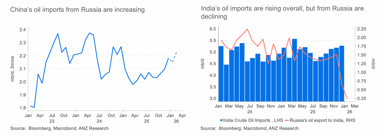 중국의 러시아산 원유 수입은 증가 중. 인도의 전체 원유 수입은 증가했으나 러시아산 수입은 감소.