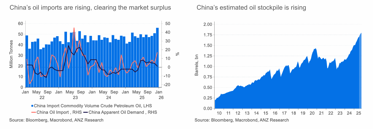 중국의 원유 수입은 증가하며 시장의 초과공급을 흡수. 중국의 추정 원유 재고는 증가하고 있음. 중국은 원유 비축을 지속하며 초과 물량을 흡수하고 있음.
