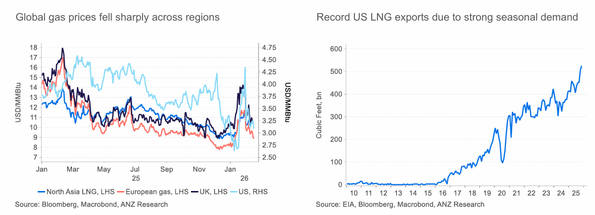 글로벌 가스 가격은 지역 전반에서 급락. 미국 LNG 수출은 강한 계절적 수요로 사상 최고 수준. 난방 시즌 종료가 가까워지며 LNG 가격은 완화.