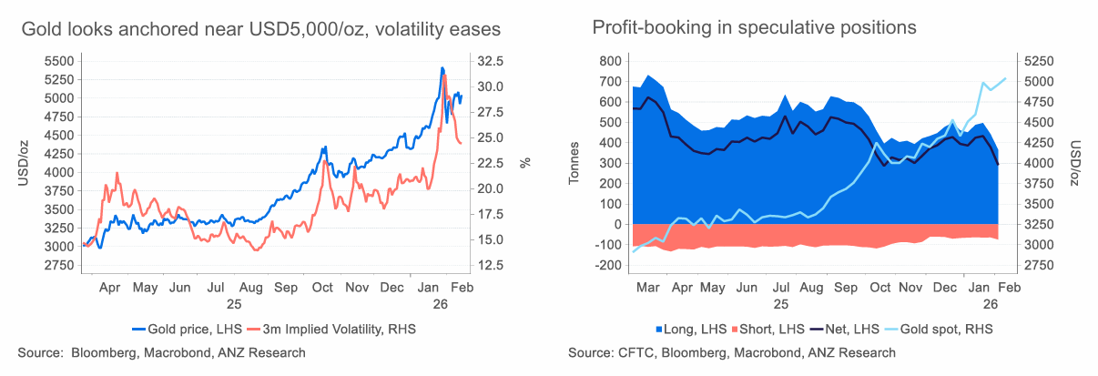 금 가격은 온스당 5,000달러 부근에서 앵커링되는 모습이며 변동성은 완화되고 있음. 최근 상승 이후 투기적 포지션에서...