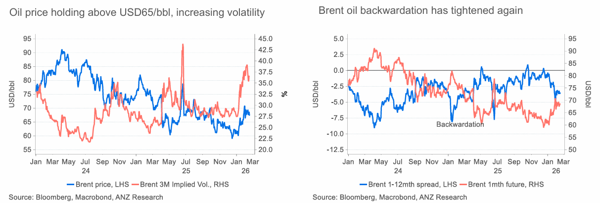 유가는 배럴당 65달러 이상에서 유지되고 있으며 변동성은 확대되고 있음. 브렌트유 백워데이션은 다시 타이트해짐. 지정학적 리스크와 그에 따른 공급 차질 가능성이 공급을 타이트하게 만들 수 있음.