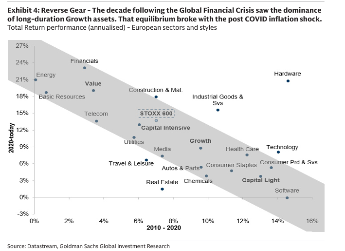 유럽 섹터 및 스타일의 연율 총수익률 비교에서 2010~2020년 대비 2020년 이후 자본집약 섹터의 상대적 강세를 시각화