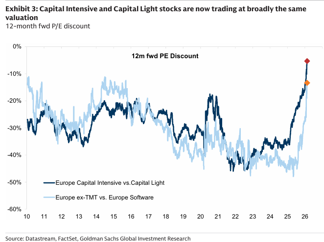 그 결과 자본집약(Capital Intensive) 기업과 자본경량 기업 간 밸류에이션 격차는 크게 축소됐음. 핵심은 이 수렴이 자본경량 기업의 전면적 디레이팅 때문이 아니라, 자본집약 기업의 리레이팅에 의해 주도됐다는 점임. AI에 직접 노출된 일부 소프트웨어 등 특정 구간을 제외하면, 밸류에이션 조정의 중심은 자본집약 기업이었음